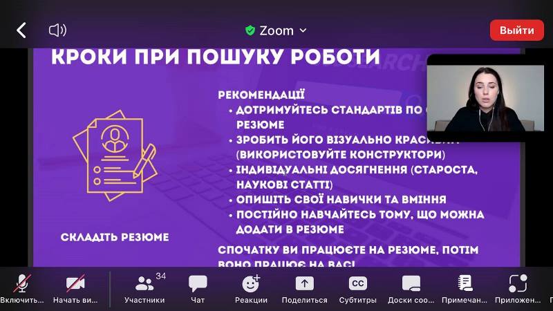 Лекторка наголосила, що не треба боятися рухатися і змінювати компанії в пошуках «своєї» і вірити у свої сили, бути наполегливим і з ентузіазмом йти до професійних цілей. Тоді обов'язково знайдете роботу мрії! Учасники зустрічі вдячні спікерці за корисні поради та чекають на наступну лекцію, яка відбудеться вже скоро.