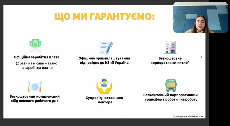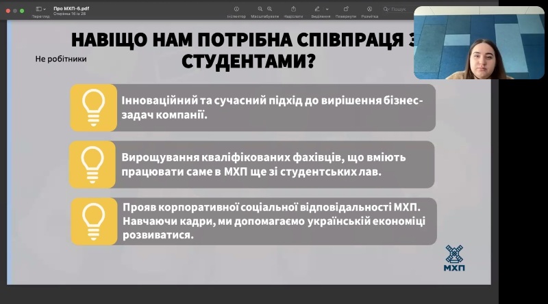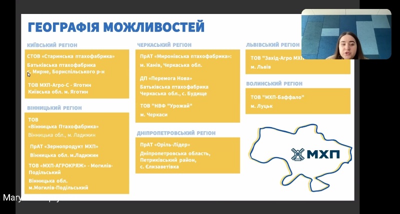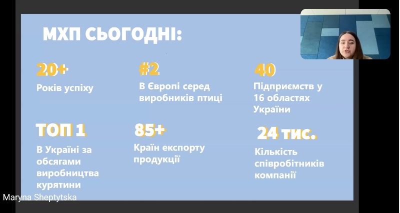 У рамках впровадження дуальної освіти в освітній процес та з метою зміцнення співпраці кафедри з ПрАТ «МХП» 8 лютого 2023 року у режимі відеоконференції фахівчиня з проєктів по роботі з молоддю від ПрАТ «МХП» Марина Шептицька розповіла про основні напрямки діяльності компанії та поділилася досвідом реалізації дуальної освіти на підприємствах компанії.