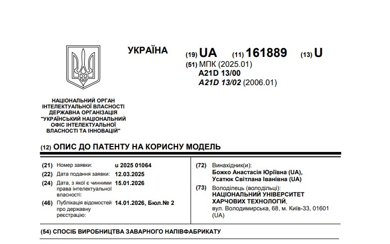 Наші винахідники стартували з отримання першого у новому році патенту на корисну модель. Колектив розробниць кафедри експертизи харчових продуктів у складі асистентки Анастасії Божко і доцентки Світлани Усатюк підтвердив свої авторські права патентом № 161889 на корисну модель «Спосіб виробництва заварного напівфабрикату», отриманим 14 січня 2026 року.