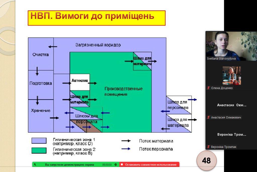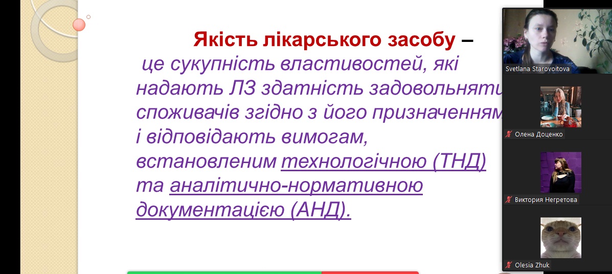 Ця дисципліна є важливою у системі підготовки, тому що забезпечує виконання цілої низки дій і робіт відповідно до чинного законодавства, адже на лекціях із «Нормативного забезпечення біотехнологічних виробництв» студенти вперше знайомляться і навчаються виконувати вимоги нормативних актів у своїй професійній діяльності. На жаль, протягом цього семестру через без пекову ситуацію здобувачі не змогли прослухати усі лекції лекторки дисципліни, доцентки, кандидатки біологічних наук Світлани Старовойтової. Але й на тих, які вдалося провести, за допомогою мультимедійних презентацій та відео студенти краще розібралися у матеріалі та мотивувалися до самостійного опрацювання матеріалу.