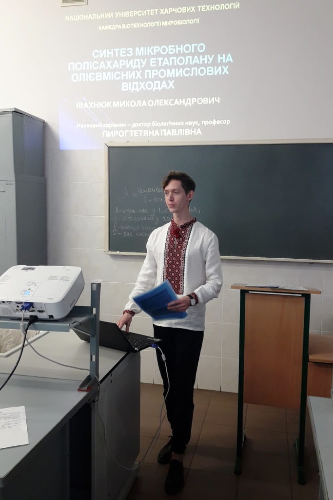 13 вересня 2018 р. відбулася довгоочікувана для аспіранта кафедри біотехнології і мікробіології, активного учасника наукового гуртка «Biotech» Миколи Івахнюка подія – представлення на засіданні кафедри результатів кандидатської дисертації за спеціальністю 03.00.20 – «біотехнологія». Тема дисертаційної роботи – «Синтез мікробного полісахариду етаполану на олієвмісних промислових відходах», керівник – д.б.н., професор Тетяна Пирог.