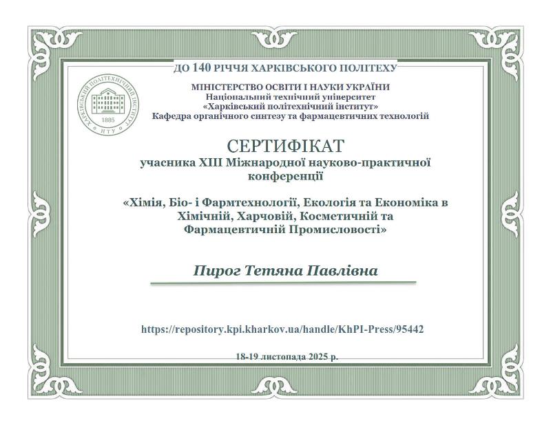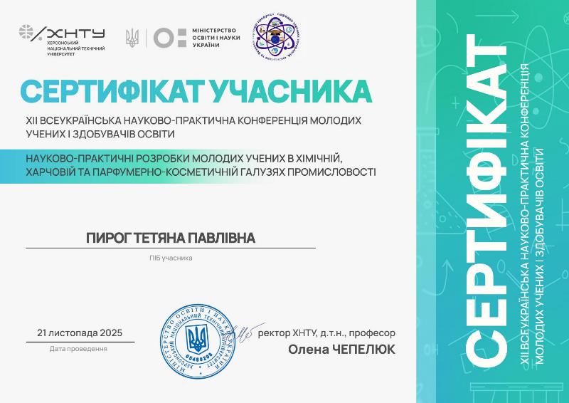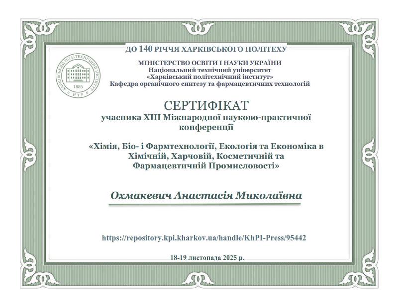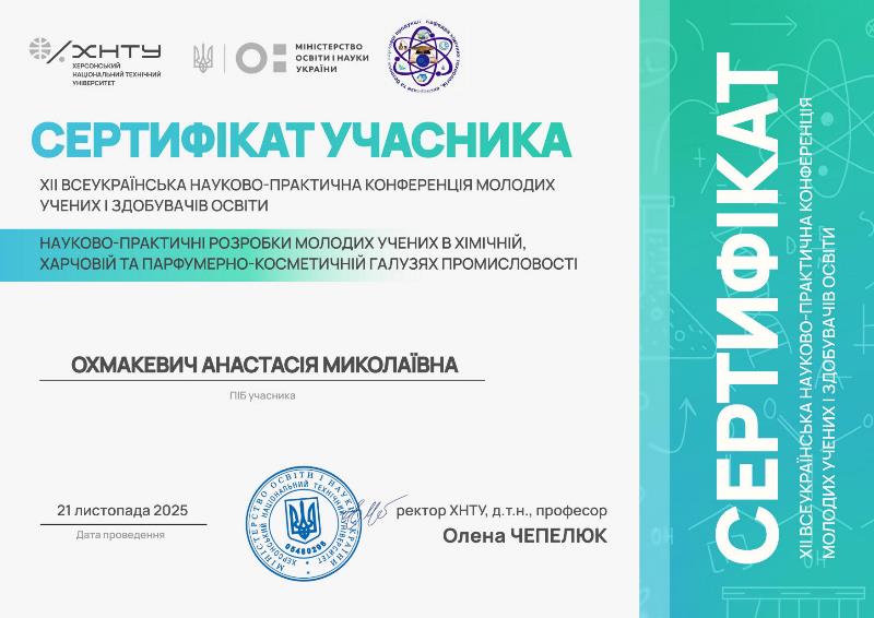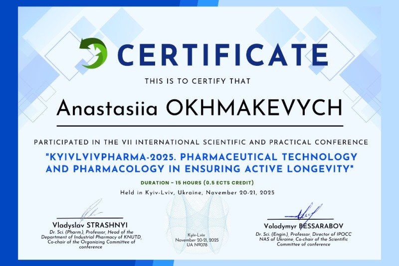 Зокрема, вона взяла участь у роботі VII Міжнародної науково-практичної конференції «KyivLvivPharma-2025. Фармацевтична технологія та фармакологія в забезпеченні активного довголіття», де зібралися провідні фахівці фармацевтичної галузі. Крім того, Анастасія взяла участь у конференції «Хімія, Біо- і Фармтехнології, Екологія та Економіка в Хімічній, Харчовій, Косметичній та Фармацевтичній Промисловості», яка об’єднала дослідників різних галузей для обговорення міждисциплінарних наукових підходів. Завершальним заходом стала участь у ХІІ Всеукраїнській науково-практичній конференції молодих учених і здобувачів освіти «Науково-практичні розробки молодих учених в хімічній, харчовій та парфумерно-косметичній галузях промисловості».