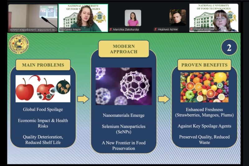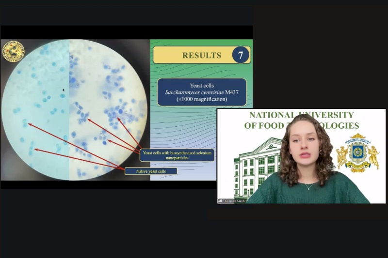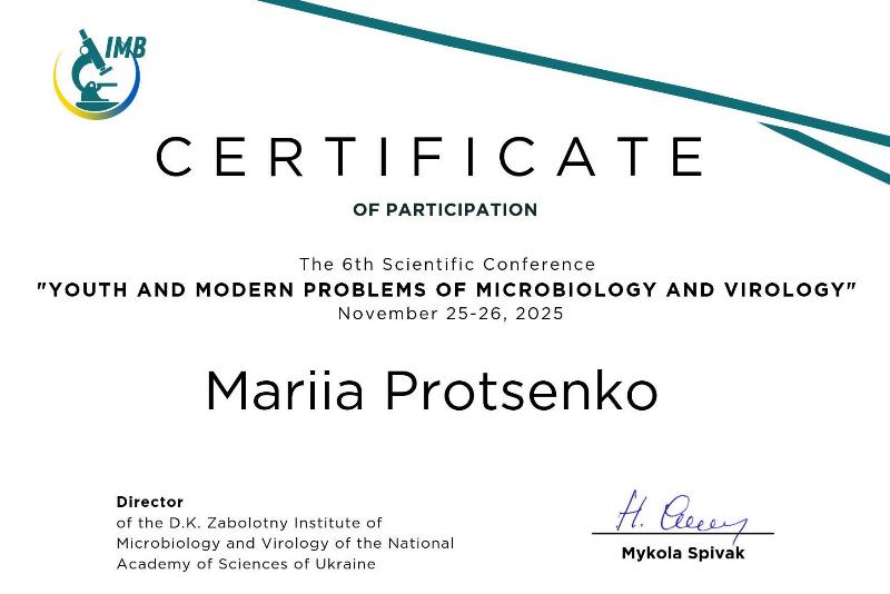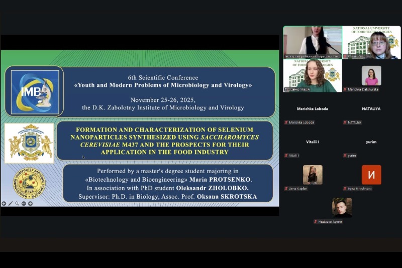 Не менш успішною була участь у наукових заходах і магістрантки Марії Проценко (керівниця – доцентка Оксана Скроцька). Її дослідження присвячене внутрішньоклітинному біосинтезу наночастинок селену з використанням дріжджів Saccharomyces cerevisiae, що має значний потенціал для створення біотехнологічно важливих наноматеріалів із медичними та фармацевтичними застосуваннями. Марія стала учасницею VI Наукової конференції «Youth and Modern Problems of Microbiology and Virology», де виступила з доповіддю англійською мовою та отримала цінні коментарі від наукової аудиторії. Її робота викликала зацікавлення серед учасників конференції, адже біогенний синтез наночастинок сьогодні є одним із найбільш перспективних напрямів сучасної біотехнології.