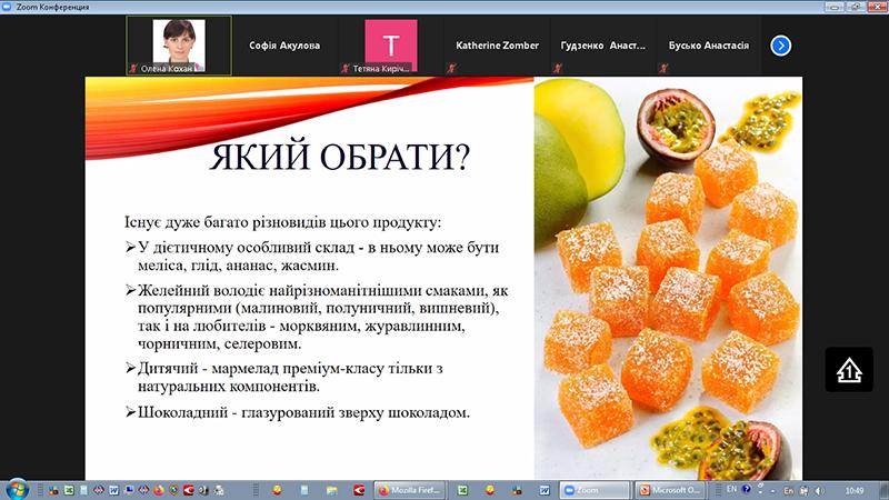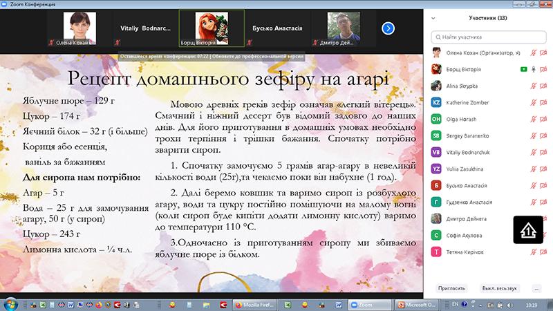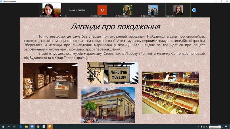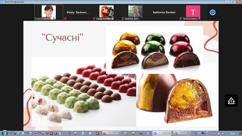 Присутні обмінялися інформацією про історію виникнення, особливості технології, рецептурного складу, способу подання різноманітних кондитерських виробів: цукерок, ірису, мармеладу, зефіру, марципану, тофі, кексів, мигдального печива, еклерів, різноманітних тортів, тістечок і відомих десертів. Деякі здобувачі навіть поділилися власними рецептами та продемонстрували фотографії процесу виробництва кондитерських виробів. Здобувачі дуже творчо і креативно поставилися до цього завдання, тому всі учасники заняття дізналися багато цікавого про походження рецептур і назв багатьох традиційних кондитерських виробів, розглянули особливості приготування різних видів ласощів. Час заняття сплинув дуже швидко, адже всіх присутніх захопила цікавість представлених матеріалів.