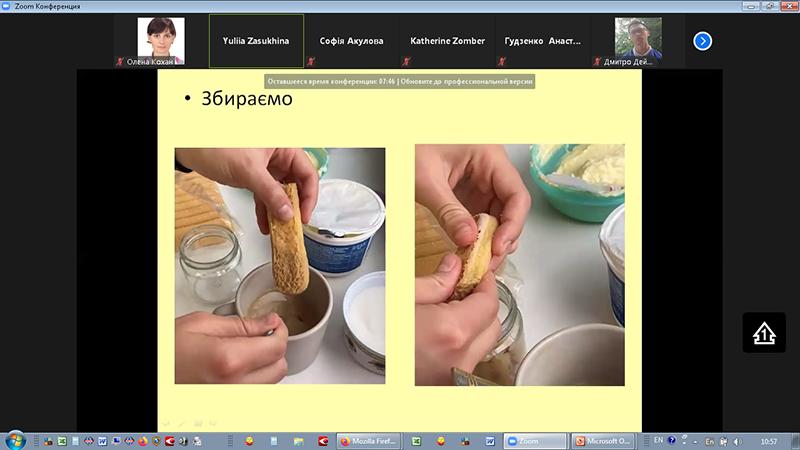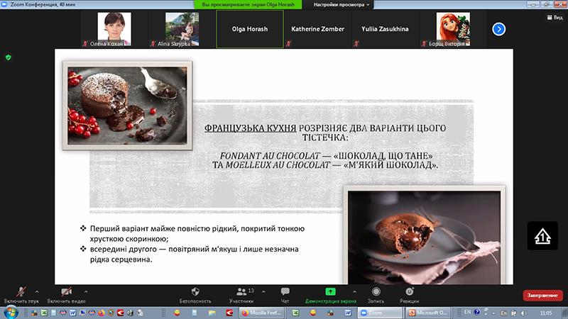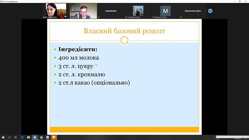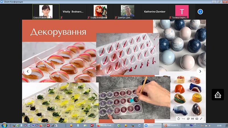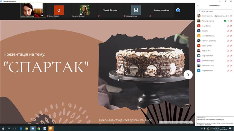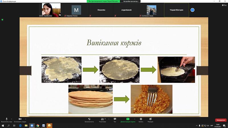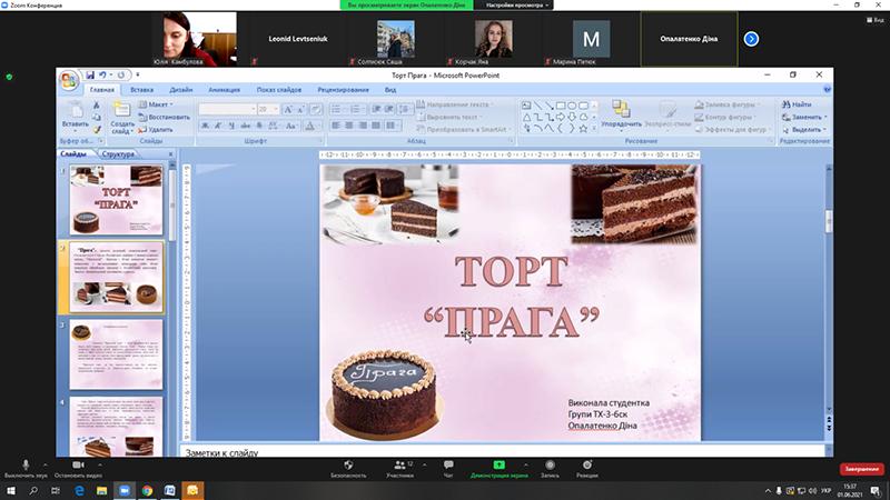 Зазвичай, на цьому занятті здобувачі виготовляють кондитерські вироби, технології яких були опановані під час вивчення дисципліни. Зважаючи на дистанційний формат навчання, в цьому році викладачі дисципліни запропонували на вибір підготувати презентації кондитерських виробів і представити їх на підсумковому занятті.