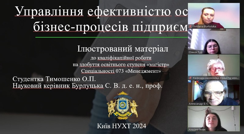 Голова державної екзаменаційної комісії, професор Олександр Бутнік-Сіверський, завідувачка кафедри економіки праці та менеджменту Тамара Березянко, гарантка програми, професорка Світлана Бурлуцька та члени комісії відзначили високий рівень підготовки й практичну спрямованість емпіричних досліджень кваліфікаційних магістерських робіт, цікаві та змістовні доповіді Олени Тимошенко («Управління ефективністю основних бізнес-процесів підприємства», керівниця – професорка Світлана Бурлуцька), В’ячеслава Юпатова («Реінжиніринг бізнес-процесів як спосіб підвищення ефективності управління підприємством», керівниця – доцентка Світлана Дунда), Альони Вовк («Управління інвестиційним проєктом впровадження інноваційних технологій на ПрАТ «Індар», керівник – професор Віктор Ємцев) та інших.