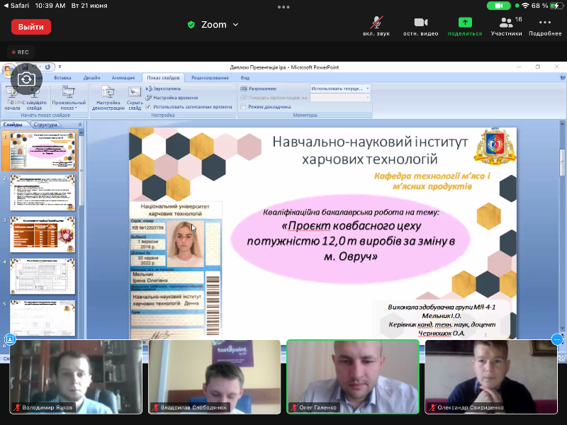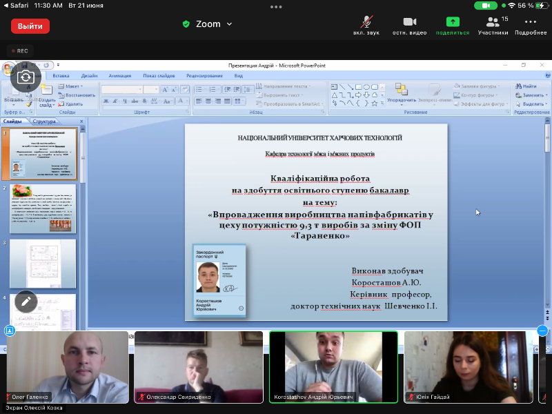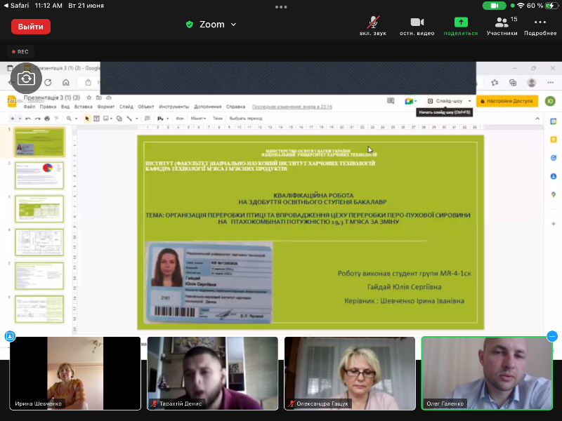 На кафедрі технології м’яса і м’ясних продуктів завершила роботу Екзаменаційна комісія з розгляду кваліфікаційних робіт здобувачів освітнього ступеня «Бакалавр» денної форми навчання, що навчалися за спеціальністю 181 «Харчові технології», освітньо-професійною програмою «Харчові технології та інженерія», яка працювала з 17 по 23 червня.
