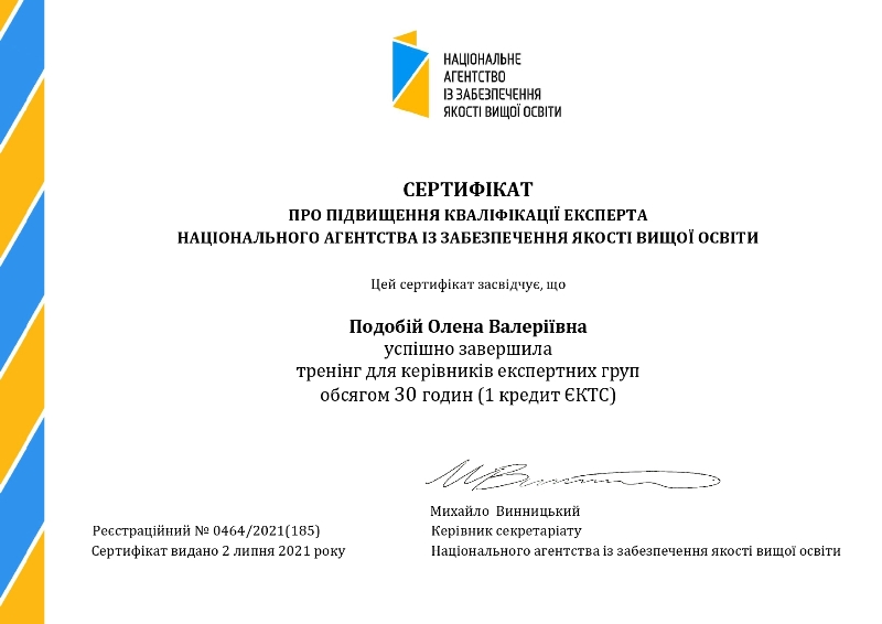 Доцентка кафедри технології жирів, хімічних технологій харчових добавок та косметичних засобів, експертка Національного агентства із забезпечення якості вищої освіти Олена Подобій взяла участь у дводенному онлайн-тренінгу для керівників експертних груп, організованому агентством.