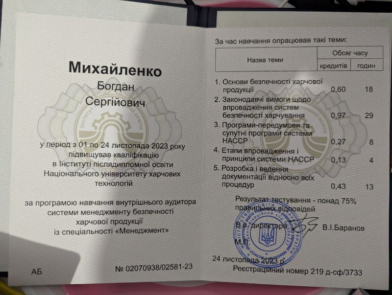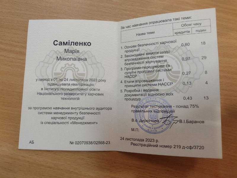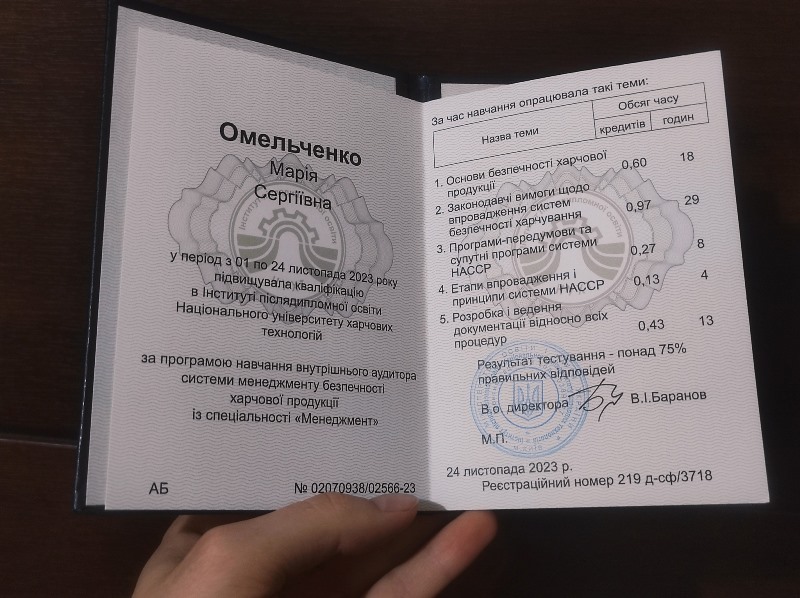 Здобувачі освітнього ступеня «Бакалавр» освітньо-професійної програми «Технології харчування» та освітнього ступеня «Магістр» освітньо-професійної програми «Технології в ресторанному господарстві» опанували hard skills у межах курсу «Внутрішній аудитор системи менеджменту безпечності харчової продукції» та підвищили кваліфікацію в Інституті післядипломної освіти НУХТ у межах 72 годин (2,4 кредити).
