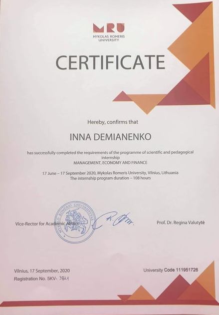Також фахове тримісячне наукове стажування задля підвищення кваліфікації пройшла доцентка Інна Дем’яненко. Наукове стажування за напрямком «Управління, економіка і фінанси» в Університеті Миколаса Ромеріса (MRU) (108 год.) м. Вільнюс (Литва) відбулося в дистанційному режимі. Програма стажування містила три модулі: управління ( управління конфліктами і стресом, ділове спілкування і вирішення проблем, лідерство і влада в спілкуванні та застосування математичних методів у професійній діяльності); економіка (міжнародна економічна система, глобальні проблеми світового господарства – економічний аспект, міжнародна торгівля, національна безпека країни); фінанси (світовий рух капіталу, світова валютна система, міжнародний фінансовий ринок, оподаткування розвинених країн).
