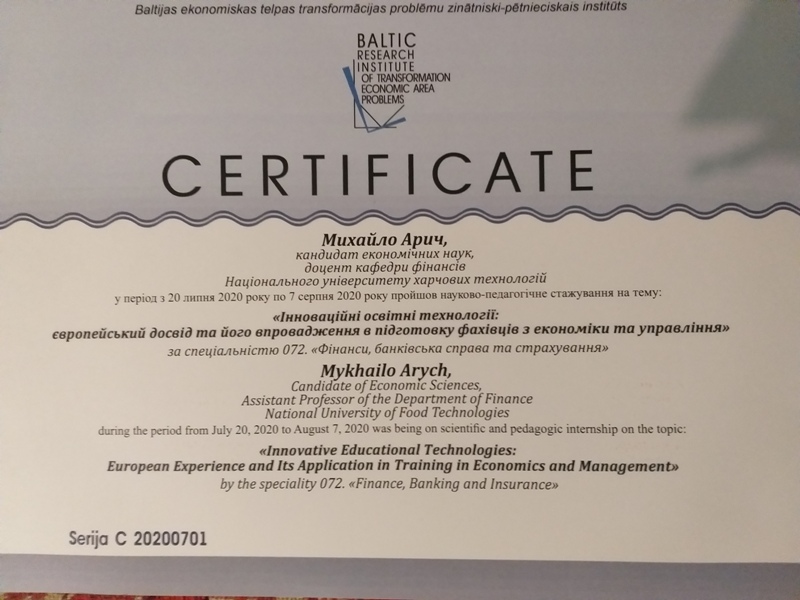 Із метою підвищення професійної педагогічної майстерності доценти Михайло Арич і Ганна Роганова на базі Балтійського науково-дослідного інституту проблем трансформації економічного простору в м. Рига (Латвія) за підтримки Причорноморського науково-дослідного інституту економіки та інновацій (Україна) пройшли міжнародне науково-педагогічне стажування за темою «Інноваційні освітні технології: європейський досвід та його впровадження в підготовку фахівців з економіки та управління» за спеціальністю 072 «Фінанси, банківська справа та страхування» обсягом 6 кредитів ECTS (180 годин).
