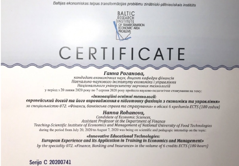 На вимогу постанови Кабінету Міністрів України від 21 серпня 2019 р. № 800 «Деякі питання підвищення кваліфікації педагогічних і науково-педагогічних працівників», відповідно до пункту 4.1.5.2 «Запуск та підтримка програм професійного розвитку для науково-педагогічних працівників, що має на меті збільшення спільноти агентів змін» операційної цілі 4.1.5 «Науково-педагогічні працівники мають конкурентний рівень оплати праці та постійний професійний розвиток» Оперативного плану Міністерства освіти і науки України на 2020 рік, із метою зростання якості надання освітніх послуг викладачі кафедри фінансів підвищили кваліфікацію шляхом стажування на міжнародному рівні у фаховому та педагогічному напрямках.