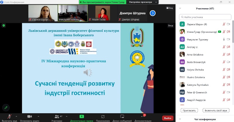 12 жовтня 2023 р. наукова спільнота кафедри готельно-ресторанної справи в продовження плідної багаторічної співпраці в черговий раз долучилася до участі у науковому заході – IV Міжнародній науково-практичній конференції «Сучасні тенденції розвитку індустрії гостинності», яка традиційно ініційована д.в.н., професоркою, завідувачкою кафедри готельно-ресторанного бізнесу Львівського державного університету фізичної культури імені Івана Боберського Марією Паскою.