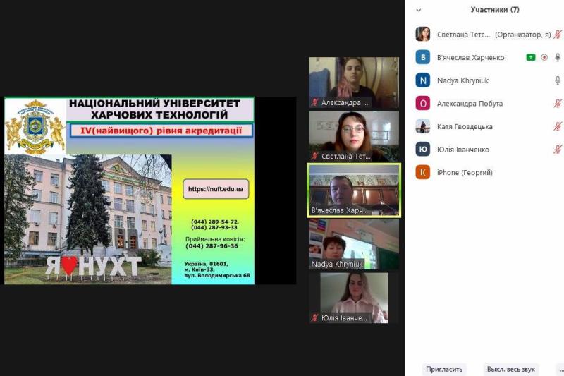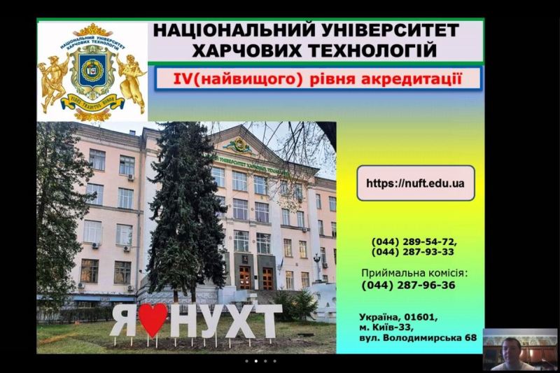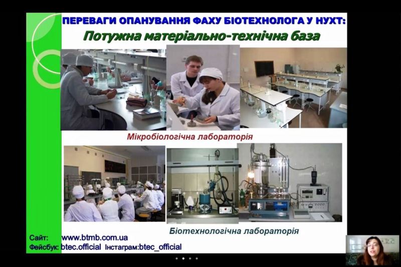 Упродовж відеоконференцій викладачі Світлана Тетеріна та В'ячеслав Харченко дуже детально розповіли про наш університет, зокрема про факультет БТЕК. Були докладно презентовані спеціальності «Біотехнологія та біоінженерія» і «Екологія», акцентована увага на перевагах їх опанування саме в нашому університеті, продемонстровані відеоматеріали щодо навчання у НУХТ, серед яких і цікаве студентське відео про лабораторні заняття. Слово для виступу було надане також студенткам факультету, що увійшли до складу профорієнтаційної команди, біотехнологам – першокурсниці Катерині Гвоздецькій та третьокурсниці Юлії Іванченко, а також, екологу – Олександрі Побуті. Дівчата охоче розповідали про навчання і студентське життя із власного досвіду. Поділилися своїм досвідом здавання ЗНО та вступу до університету, дали актуальні поради та рекомендації.