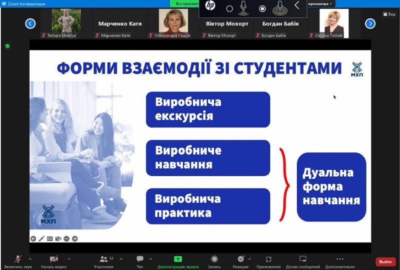 Знайомство з компанією продовжила фахівчиня відділу професійного навчання Ксенія Моторіна і зазначила, що останні роки компанія трансформує свій бізнес і перетворюється із сировинної компанії на кулінарну та активно залучає студентів для проходження практики і навчання за дуальною освітою, працевлаштування та стажування. Гості звернули увагу здобувачів на ключові компетенції МХП, зокрема орієнтацію на результат, критичне мислення, розвиток, комунікацію, інноваційність і співробітництво.