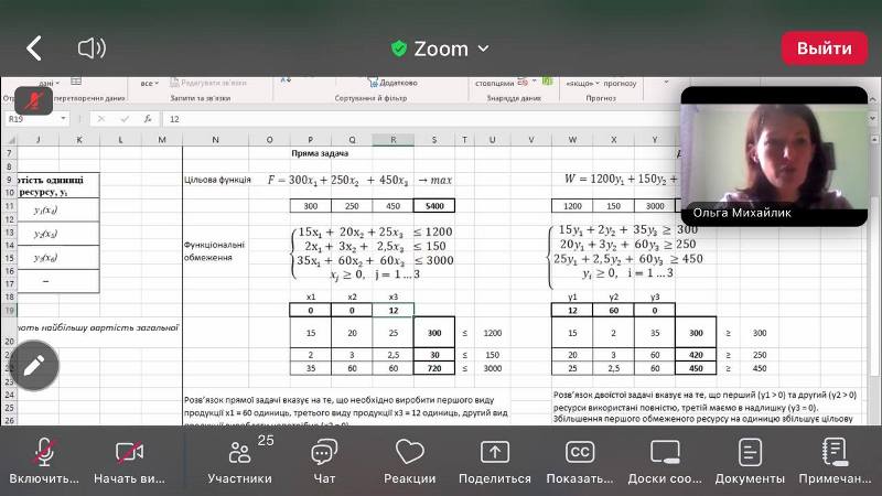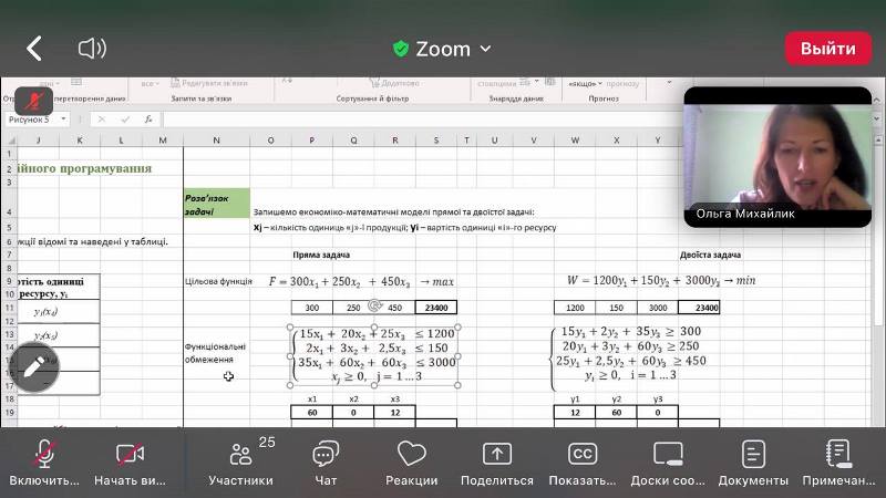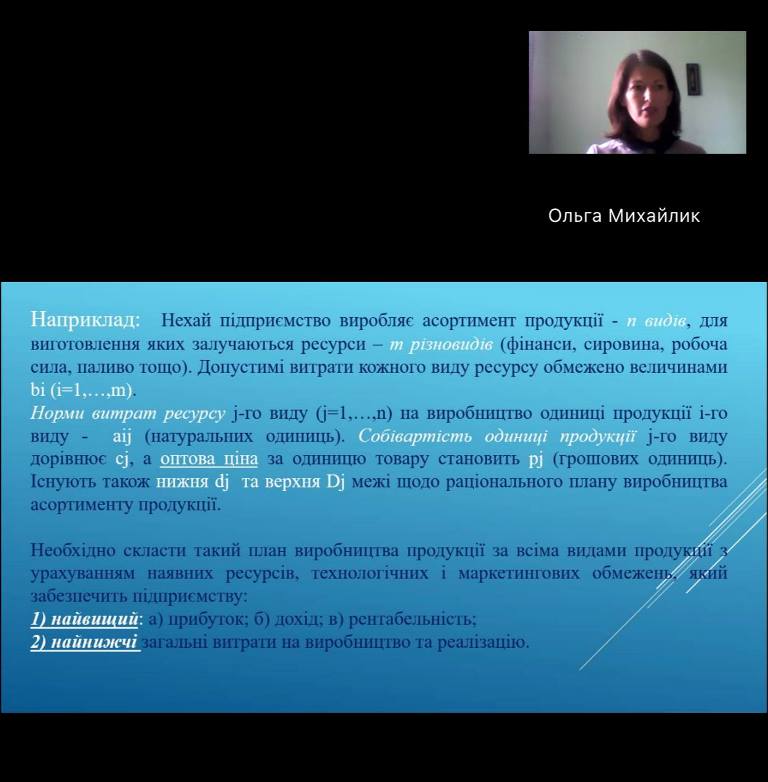 Ольга Михайлик, працювала зі здобувачами третього курсу освітніх програм «Економіка підприємства» і «Економіка та правове забезпечення бізнесу» над темою «Теорія достовірності та двоїсті оцінки лінійних оптимізаційних задач» в межах навчальної «Економіко-математичні методи та моделі». Після відвідування заняття виявилося, що тема не така складна як звучить, і лекторка всім просто і доступно пояснила про складне. Лекція була структурованою, змістовною і насиченою не лише теоретичними моментами, а і й демонстрацією їх прикладного застосування. Фаховість і висококваліфікованість викладачки не викликає сумнівів та підтверджується індивідуальним підходом до кожного здобувача освіти, використанням сучасних методик викладання і здатністю створювати на занятті комфортні умови, де складні обчислення стають зрозумілими і цікавими для всіх.