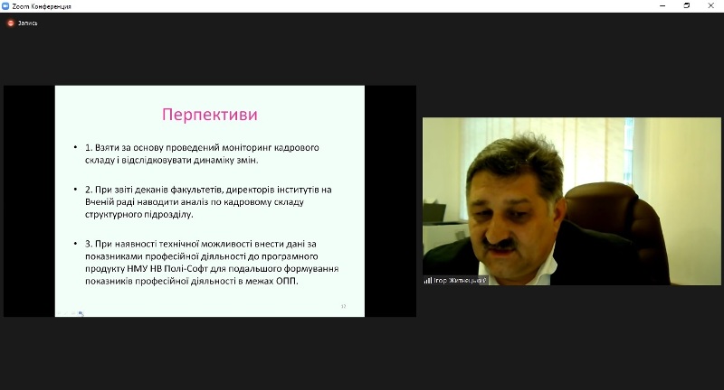 Далі заслухали аналіз кадрового забезпечення підготовки здобувачів вищої освіти за освітніми програмами, представлений директором Центру моніторингу якості та координації освітньої діяльності університету Ігорем Житнецьким. Доповідач зазначив, що питання відповідності науково-педагогічних працівників освітнім компонентам, які вони викладають, а також наявність у них досягнень у професійній діяльності відповідно п.п. 37 та 38 Ліцензійних умов провадження освітньої діяльності, є актуальною стратегічною задачею. Слід врахувати, що у наступному навчальному році заплановано провести акредитацію 21 освітньої програми бакалавра та 20 освітніх програм магістра, а питання відповідності кадрового складу є одним із визначальних. Тому вченою радою було ухвалено директорам інститутів, деканам факультетів до 3 грудня перевірити достовірність внесених даних стосовно відповідності науково-педагогічних працівників дисциплінам, які вони викладають на освітніх програмах, та оновити досягнення у професійній діяльності у Єдиній державній електронній базі з питань освіти; забезпечувати своєчасність подання достовірної інформації для внесення до ЄДЕБО двічі на рік – у вересні та березні; завідувачам кафедр, гарантам освітніх програм при розподілі навчального навантаження перевагу надавати науково-педагогічним працівникам, що мають не менше 4 пунктів досягнень у професійній діяльності за останні п’ять років; членам конкурсної комісії по відбору претендентів на заміщення вакантних посад звертати особливу увагу на наявність у претендентів необхідної кількості досягнень у професійній діяльності.