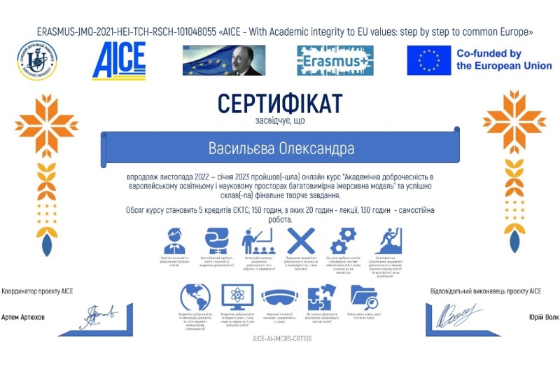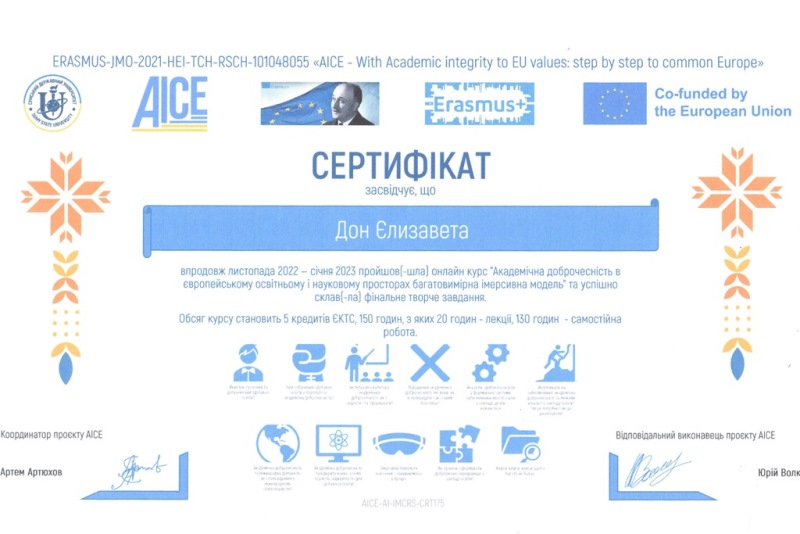 Цього разу здобувачки-біотехнологині групи БТ-4-2 Олександра Васильєва і Єлизавета Дон вирішили розширити знання, щодо академічної доброчесності, пройшовши курс «Академічна доброчесність в європейському освітньому і науковому просторах: багатовимірна імерсивна модель» у рамках проєкту «AICE Project Course» (5 кредитів ЄКТС). Студентки змогли подискутувати на найгарячіші питання, щодо відповідальності за порушення академічної доброчесності та шляхів зниження академічної недоброчесності в освітньому колі, а також самостійно змоделювати ситуації та розібрати, як діяти в тій чи іншій ситуації у ролі здобувача та викладача.