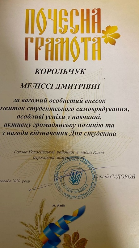 За вагомий особистий внесок у розвиток студентського самоврядування, особливі успіхи у навчанні, активну громадську позицію та з нагоди відзначення Дня студента Почесною грамотою голови Голосіївської районної в місті Києві державної адміністрації також була відзначена голова студентської ради факультету готельно-ресторанного та туристичного бізнесу Мелісса Корольчук.