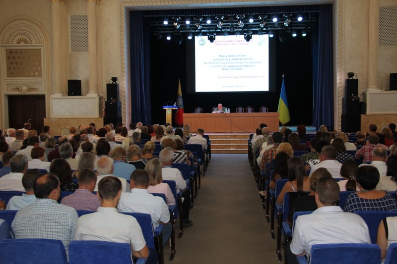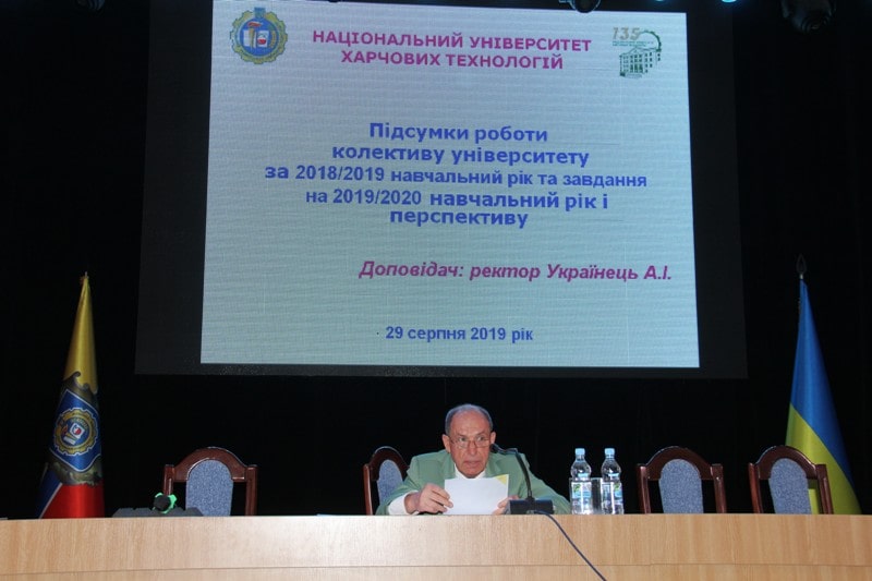 У виступі ректора йшлося про зміни, що чекають на освітянську галузь в цілому й завдання, що у зв’язку з цим постають перед нашим колективом. Він зазначив, що багато в чому НУХТ працює на випередження, зокрема, ми – перші в Україні, хто вже розпочав навчання за новими навчальними програмами, що відповідають європейським. Ректор детально зупинився на закордонних стажуваннях наших викладачів і впровадженні ними здобутого досвіду у навчальний процес університету. Також ректор повідомив, що 21 серпня МОН своїм наказом затвердило склад Наглядової ради НУХТ. Її очолив Перший віце-президент Національної академії аграрних наук України Михайло Гладій. Присутні дізналися про персональний склад ради та її функції. Варто вказати, що 70% складу Наглядової ради НУХТ – представники провідних харчових підприємств нашої країни. Крім того, ректор говорив про місце університету у рейтингах вітчизняних вишів, передові позиції нашого колективу в організації навчального процесу, якість навчального контенту, високий ступінь впровадження дистанційних технологій й високий рівень підготовки викладацького та допоміжного персоналу. Зупинився він і на реаліях сьогодення, зокрема на результатах вступної кампанії цього року. Ректор детально розказав про обсяги державного замовлення й критерії, які впливають на їх формування, зробив порівняльний аналіз із минулим роком, акцентував увагу на необхідності обов’язкового ліцензування нових актуальних для ринку праці спеціальностей та розвитку співпраці з роботодавцями.