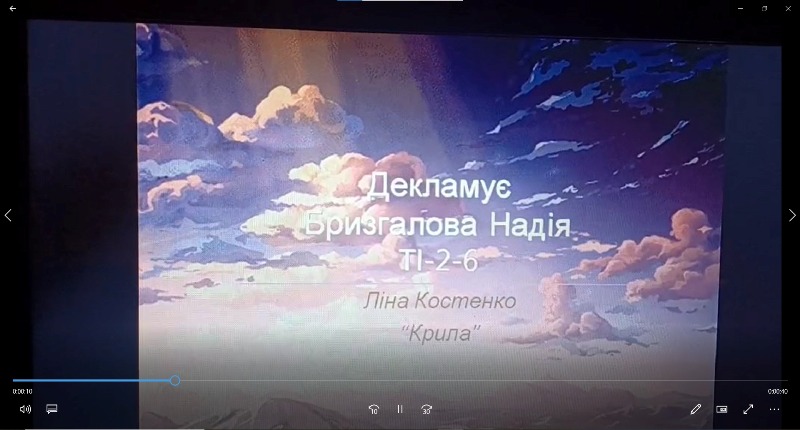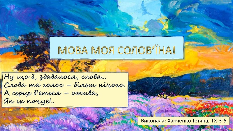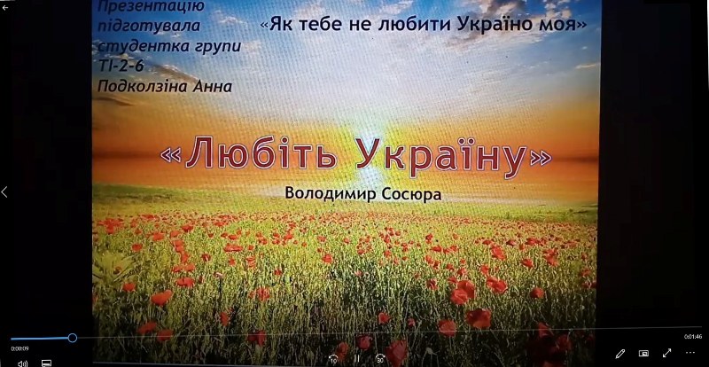 Існує безліч прекрасних віршів про нашу рідну мову та Україну. І викладачі кафедри технології хлібопекарських і кондитерських виробів разом зі здобувачами освіти груп ТІ-1-4, ТІ-1-5, ТІ-2-6, ТХ-3-5, ТХ-3-6 та ТХ-3-14ск Навчально-наукового інституту харчових технологій зібралися, щоб поговорити про мову та поезію. Не зважаючи на технічні збої, постійні відключення світла та проблеми зі зв’язком, здобувачі підготували та представили чудові, зворушливі презентації з аудіозаписами віршів на теми «Мова моя солов’їна» та «Як тебе не любити, Україно моя». Студентка групи ТХ-3-5 Ірина Черкас навіть поділилася віршами своєї бабусі Галини Яківни.
