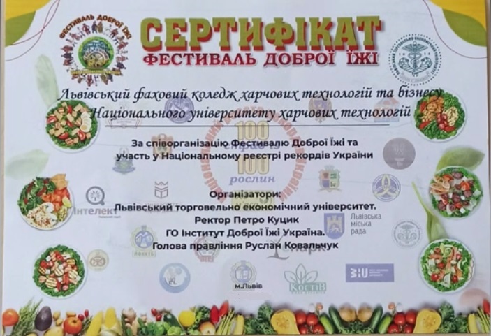 Студенти спеціальності 181 «Харчові технології» та викладачі Львівського фахового коледжу харчових технологій та бізнесу НУХТ взяли участь у трьох локаціях фестивалю «Доброї їжі»: у Книзі Рекордів України; у популяризації рослинної їжі, яка ґрунтується на гармонії з природою та у дискусії круглого столу «Освіта і наука – Бізнес – Держава – Єдина Платформа».