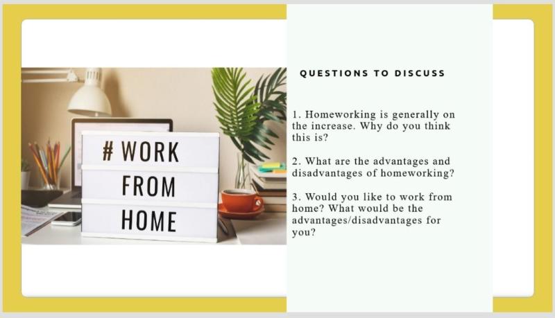 Викладачкою були застосовані комунікативний, інтерактивний, аудіо-лінгвістичний методи та метод наочності. Крім того, використовувався метод flipped classroom (перевернуте заняття). Студенти вдома переглядали відео про переваги і недоліки роботи в офісі і вдома та виконували вправи. У онлайн-аудиторії відбулася жвава дискусія з цієї актуальної теми. Здобувачі активно брали участь у обговоренні, аргументуючи свої відповіді прикладами з власного досвіду.