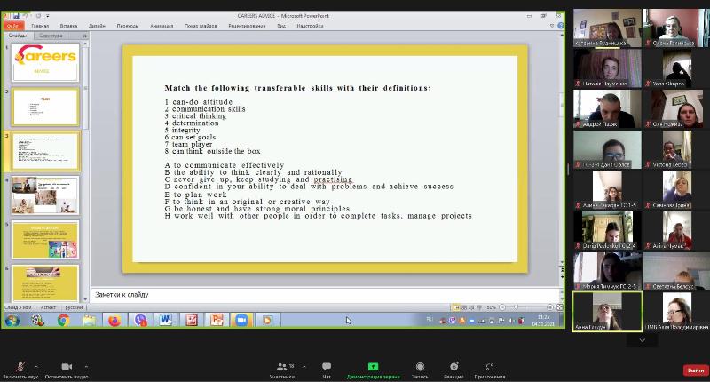 4 листопада викладачка кафедри іноземних мов професійного спрямування Катерина Рудницька провела відкрите практичне заняття з теми «Careers advice» (поради щодо працевлаштування) з дисципліни «Іноземна мова (за професійним спрямуванням)» для здобувачів освіти групи ГС-2-5 факультету готельно-ресторанного та туристичного бізнесу.