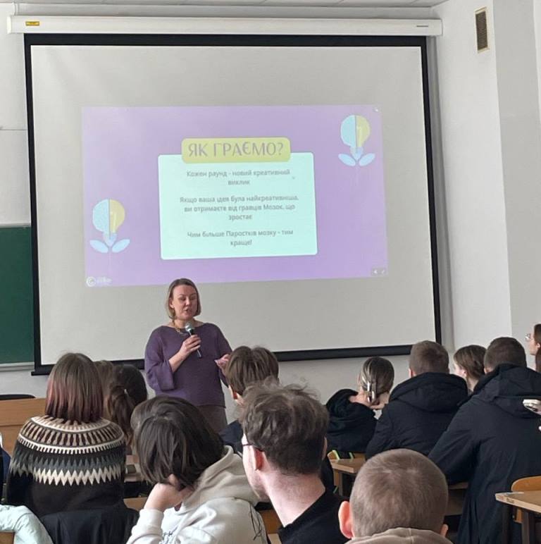 Зокрема, з керівницями освітніх проєктів компанії «Кернел» Юлією Дуднік і Валентиною Грінченко студенти на всю креативили. Бо саме це вимагалося у грі ФАК (файно активує креатив). Шість команд – «Булочкі», «Мовчуни», «Хтоми», «Котики», «Кубіки» і «Спам» у кожному раунді гри намагалися видати найкреативнішу ідею, щоб отримати Мозок і максимально збільшити кількість паростків у ньому. Завдання були цікавими – наприклад, придумати нові слова на основі вже існуючих так, щоб іншим був зрозумілий їх сенс, або креативно розшифрувати відомі абревіатури. Найкреативнішою цього дня виявилася команда «Спам».