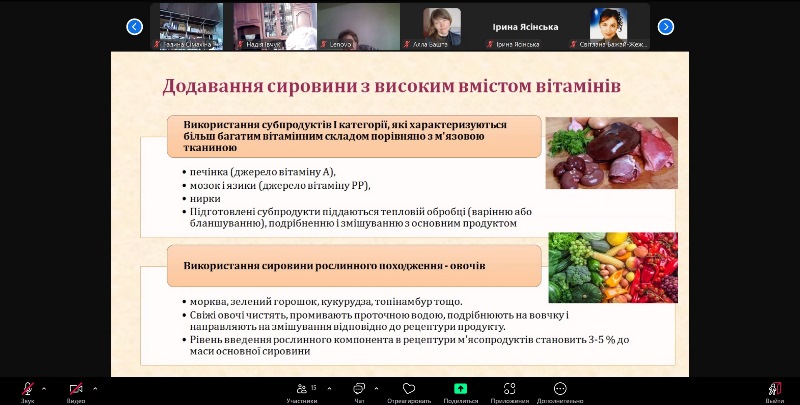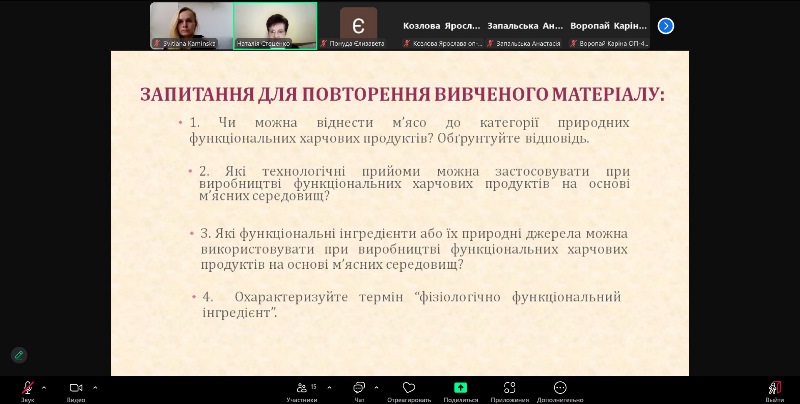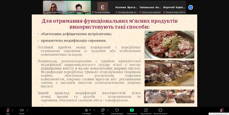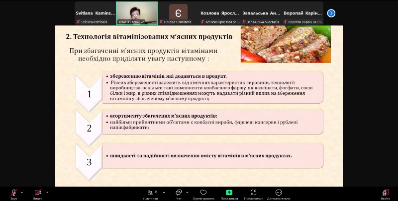 Важливим аспектом лекції було те, що розглядалися як описані у сучасній літературі технології функціональних м’ясних продуктів, так і ті, що були розроблені викладачами кафедри технології оздоровчих продуктів за участю здобувачів вищої освіти.