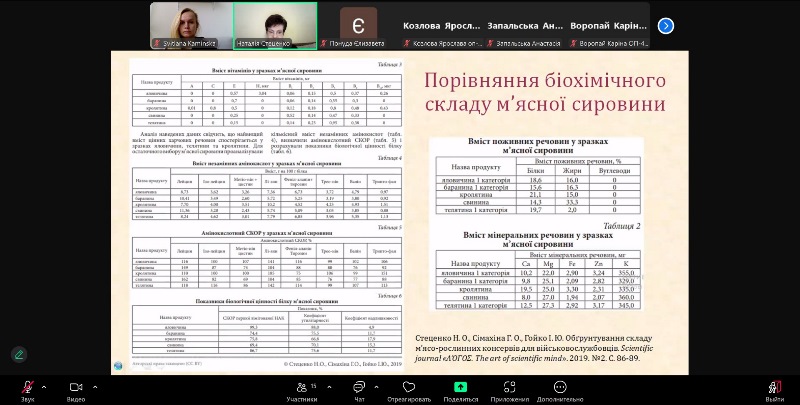 Лекція супроводжувалася презентацією, в якій була використана значна кількість власних фотоматеріалів, що відображали напівпродукти та готові функціональні паштети, м’ясо-рослинні продукти з комбінованим складом сировини, фаршеві заморожені вироби, які створювалися в лабораторіях кафедри. Презентація містила активні покликання, за допомогою яких студенти можуть відкривати рекомендовану літературу, вивчати її та виконувати завдання для самостійної роботи.