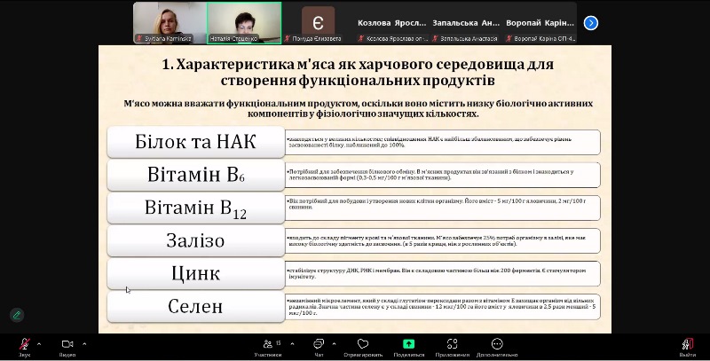 Логічно та послідовно інформація про біохімічний склад основної сировини доповнювалася відомостями про нутрієнти, які доцільно використовувати як функціональні інгредієнти при збагаченні м’ясних середовищ. Лекторкою були проаналізовані сучасні технології низькокалорійних м’ясних продуктів, а також продуктів, збагачених вітамінами, мінеральними речовинами, харчовими волокнами, поліненасиченими жирними кислотами та пребіотиками. Як підсумок, були сформульовані загальні рекомендації по створенню комбінованих функціональних продуктів на м’ясній основі.