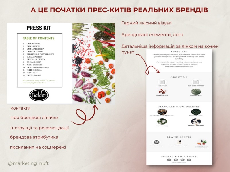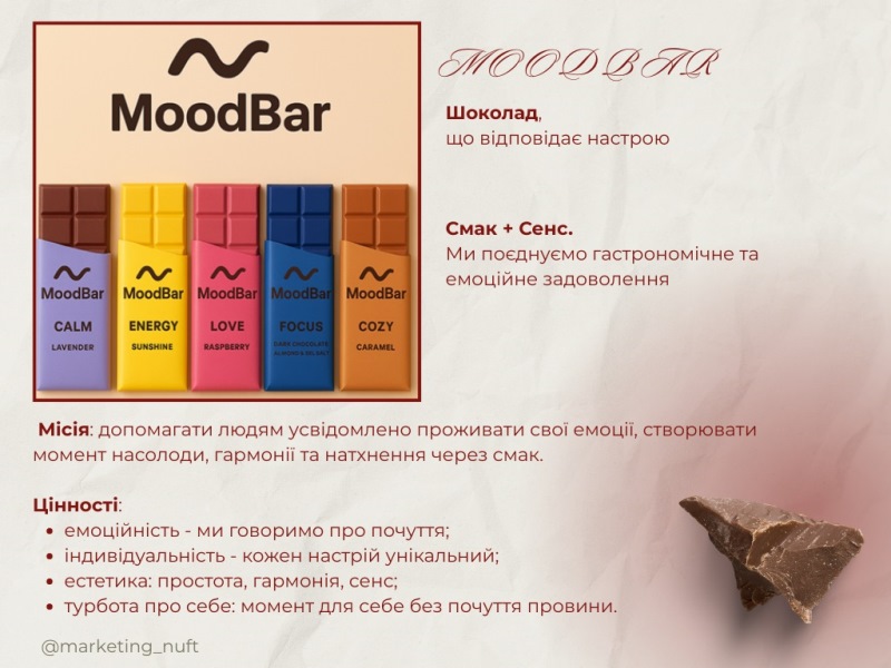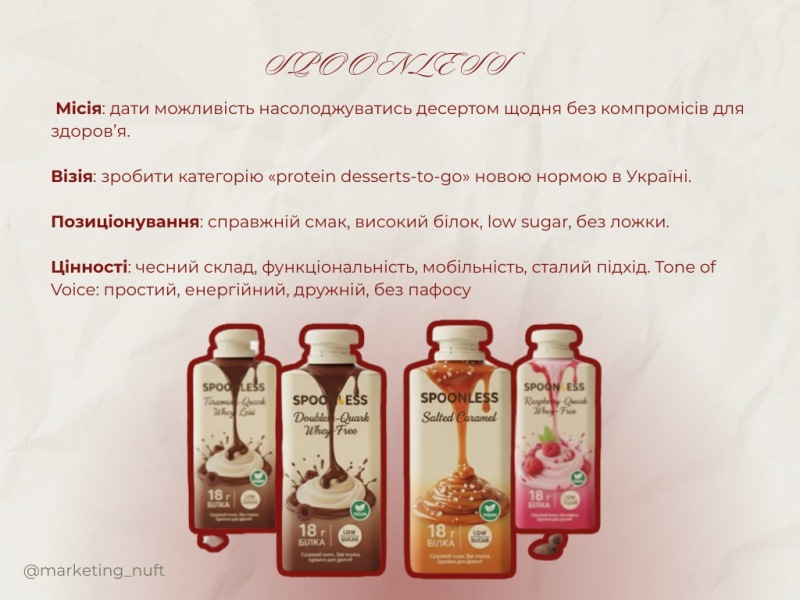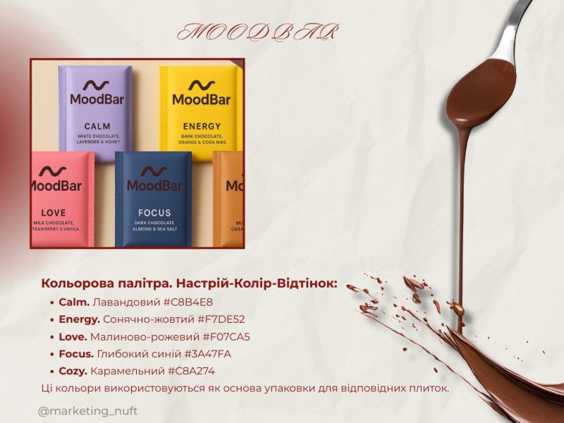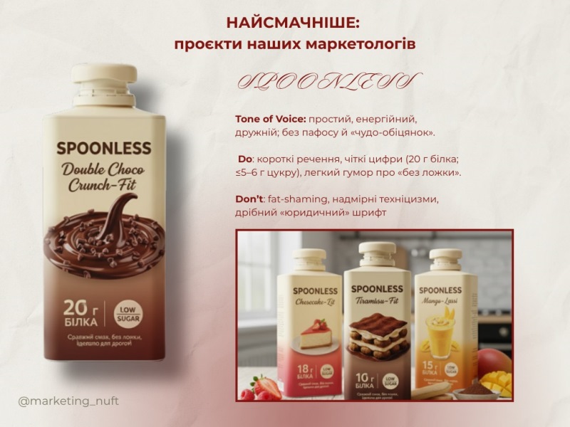 Після обговорення теоретичних аспектів розпочалася найочікуваніша частина зустрічі – практична. Майбутні маркетологи працювали над створенням авторських концепцій харчових брендів – визначили їхню цінність, позиціонування, цільову аудиторію, ключові меседжі та «tone of voice». Окрему увагу команди приділили візуальній айдентиці, презентувавши власні брендбуки та цифрові прес-кити як елементи професійної комунікації з медіа та споживачами.