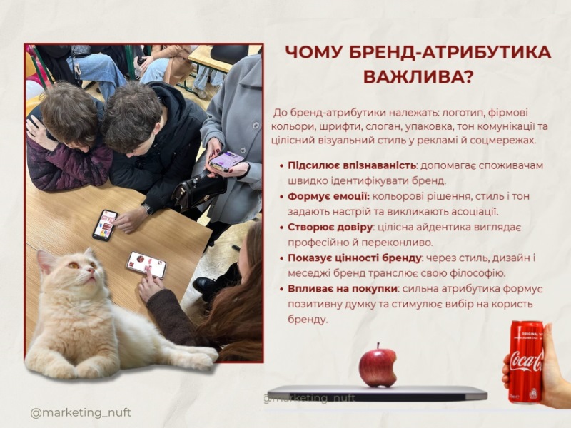 Команди представили змістовні доповіді, присвячені ключовим PR-інструментам та їхній ролі у формуванні комунікаційної стратегії бренду. У фокусі уваги опинились приклади бренд-атрибутики провідних світових компаній – «Nike», «Coca-Cola», «Netflix», «LEGO», «McDonald's» та багатьох інших. Студенти проаналізували логотипи, фірмові стилі, слогани, візуальні коди та тональність комунікацій, продемонструвавши глибоке розуміння механізмів формування впізнаваності й емоційного зв’язку зі споживачами.