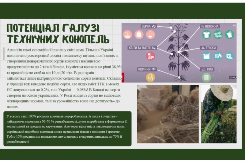 Зокрема, розглянули біотехнологічні підходи до створення сортів і вирощування технічних і медичних конопель в Україні, висвітлюючи їхню універсальність як сільськогосподарської культури, що використовується у понад 50 галузях економіки. Адже українським науковцям вдалося вивести сорти промислових конопель із рекордно низьким вмістом психотропної речовини (до 0,08%), що дозволяє займати перше місце за селекцією по всьому світу.