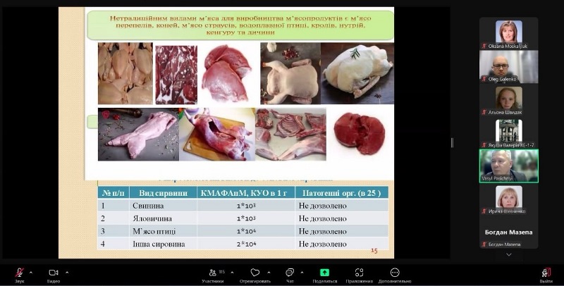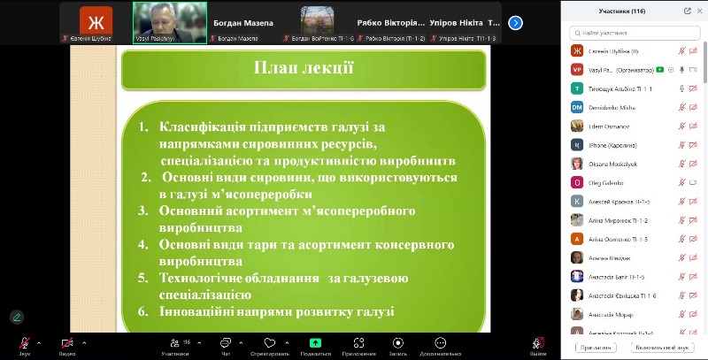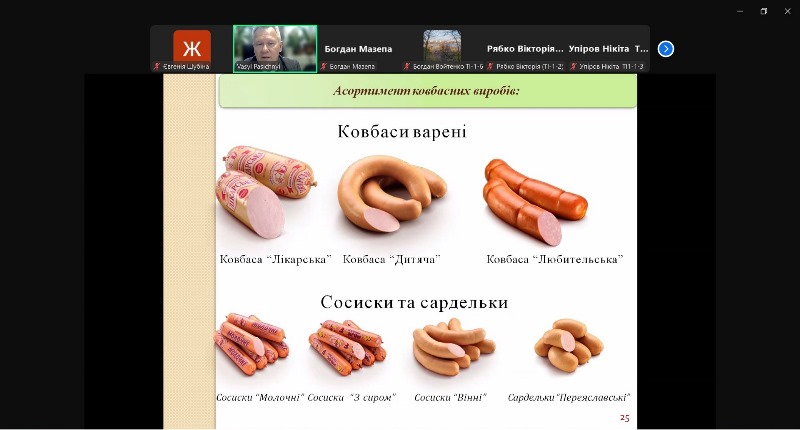 У рамках лекції здобувачі ознайомилися з класифікацією м'ясопереробних підприємств, їх спеціалізацією, видами основної і нетрадиційної сировини та базовим асортиментом м'ясопереробних підприємств і особливостями забезпечення якості і безпечності продукції в технологіях м'ясопереробної галузі.