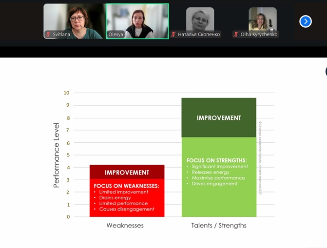 Важливою практичною складовою стало те, що пані Олеся поділилася цікавими методиками, які можуть використати здобувачі освіти для визначення власних сильних сторін – IKIGAI, Red Bull Wingfinder, Clifton 34 strengths. Наприкінці лекції гостя надала декілька практичних порад, щоб стати успішною особистістю.