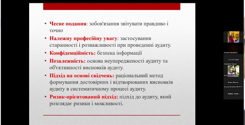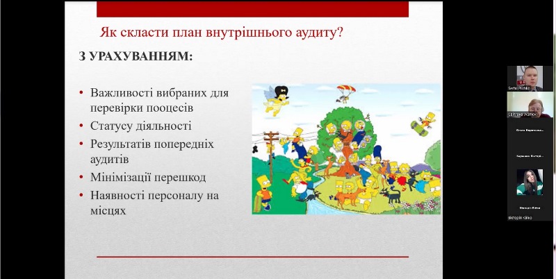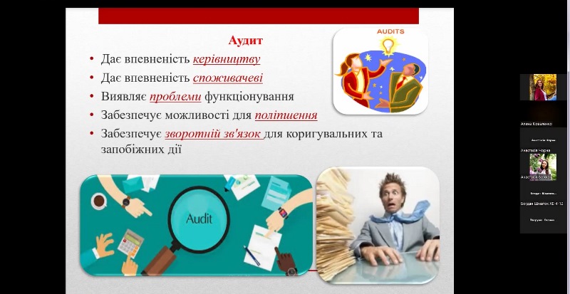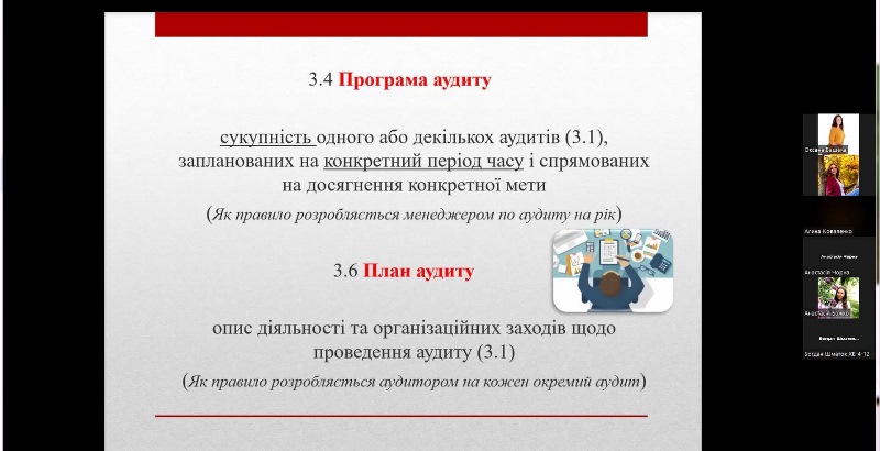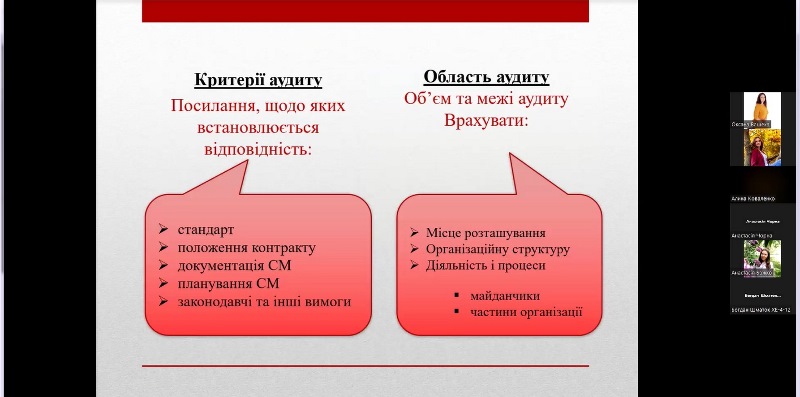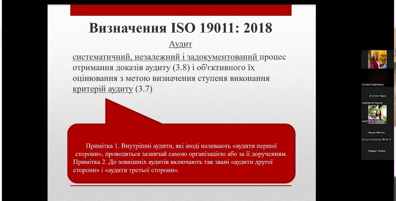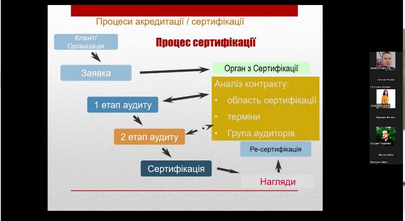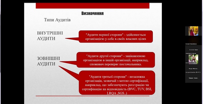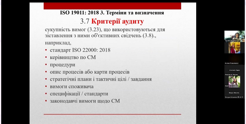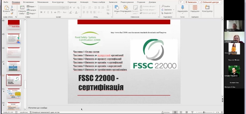 Під час заняття були висвітлені основні питання щодо законодавчих і нормативних вимог до проведення аудитів системи управління безпечністю харчових продуктів за стандартами ISO 22000 і FSSC 22000, Настанов з проведення аудитів систем менеджменту відповідно до ISO 19011: 2018 (Е) та Положення ISO/TS 22003, в якому визначені порядок проведення аудитів і сертифікації систем менеджменту безпечності харчових продуктів, побудованих відповідно до вимог стандарту ISO 22000.