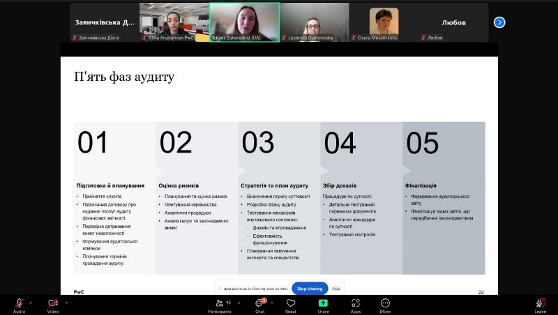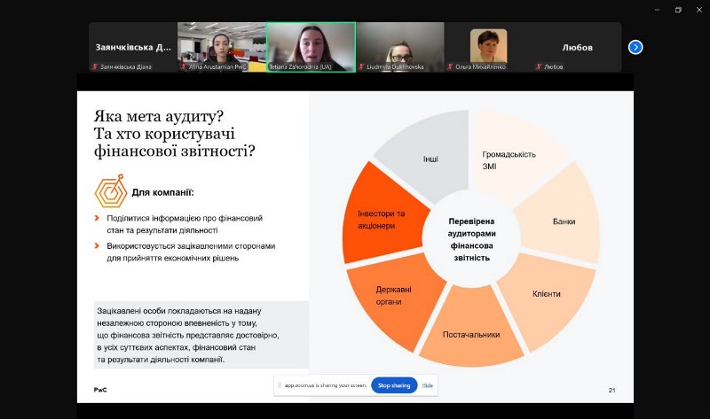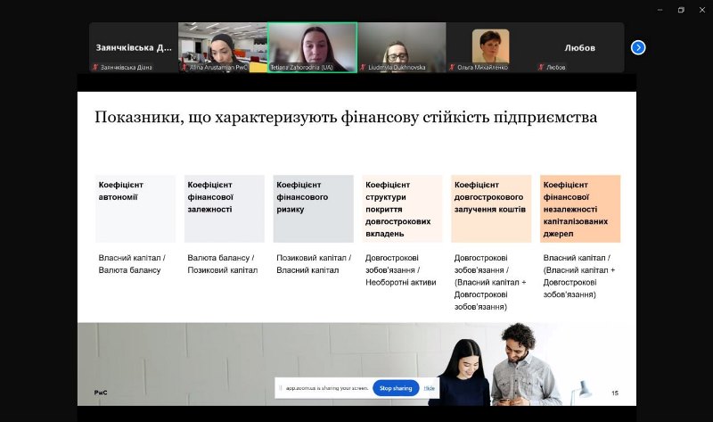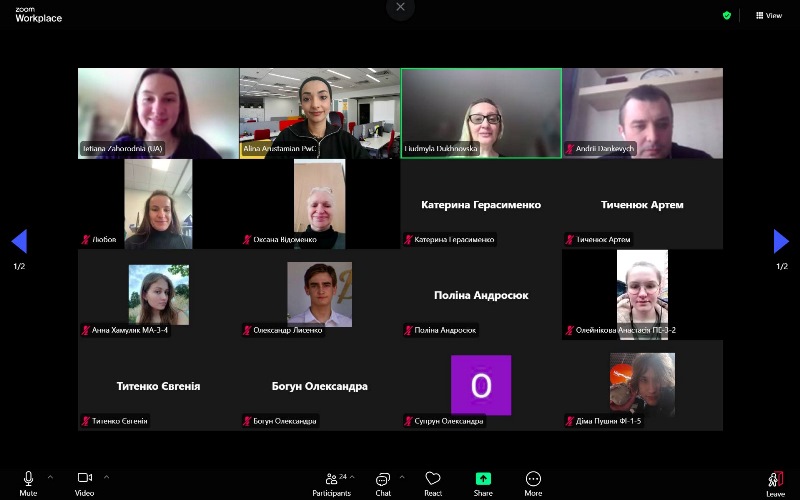 Спікерками заходу виступили спеціалістка з просування бренду роботодавця PwC Аліна Арустамян і менеджерка відділу аудиту Тетяна Загородня. Було проаналізовано основні показники оцінювання фінансового стану підприємства, продемонстровано практичний кейс використання фінансових індикаторів під час прийняття управлінських рішень, а також визначено роль аудиту фінансової звітності в умовах сучасного бізнес-середовища.