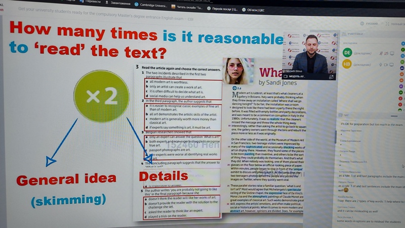 Організатори онлайн-заходів запропонували його учасникам основні підходи при підготовці студентів до іспиту, провели аналіз деяких типових завдань і поділилися ефективними стратегіями опрацювання здобувачами завдань ЄВІ з англійської мови. Крім того, обговорили, з якими труднощами стикаються викладачі при підготовці студентів до ЄВІ та самі студенти. Доповідачі онлайн-семінарів порекомендували багато корисних матеріалів для підготовки до іспиту та вдосконалення знань і умінь здобувачів освіти.