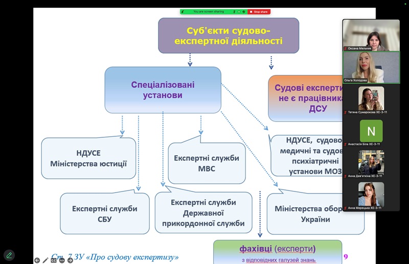 Фахівчиня поділилася зі здобувачами освіти практичними напрацюваннями та реальними кейсами, які висвітлюють специфіку роботи судового експерта. Вона детально зупинилася на ключових аспектах судово-експертної діяльності – основних принципах проведення експертиз, особливостях судових товарознавчих експертиз, суб’єктах експертної діяльності, вимогах до професійної підготовки судових експертів, а також на процедурі набуття відповідної кваліфікації.