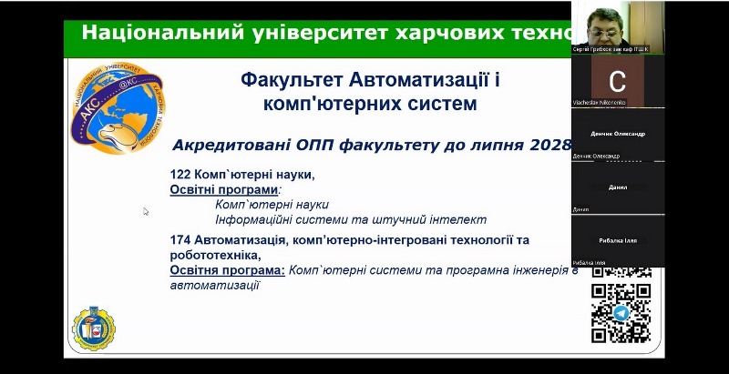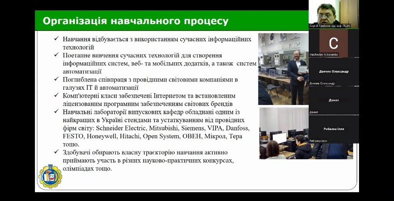Основний акцент професор зробив на спеціальності факультету автоматизації і комп’ютерних систем, детально ознайомивши слухачів із освітніми програмами своєї кафедри, акредитованими до 2028 року, матеріально-технічним забезпеченням навчального процесу, практичною складовою підготовки студентів, успішним працевлаштуванням випускників.