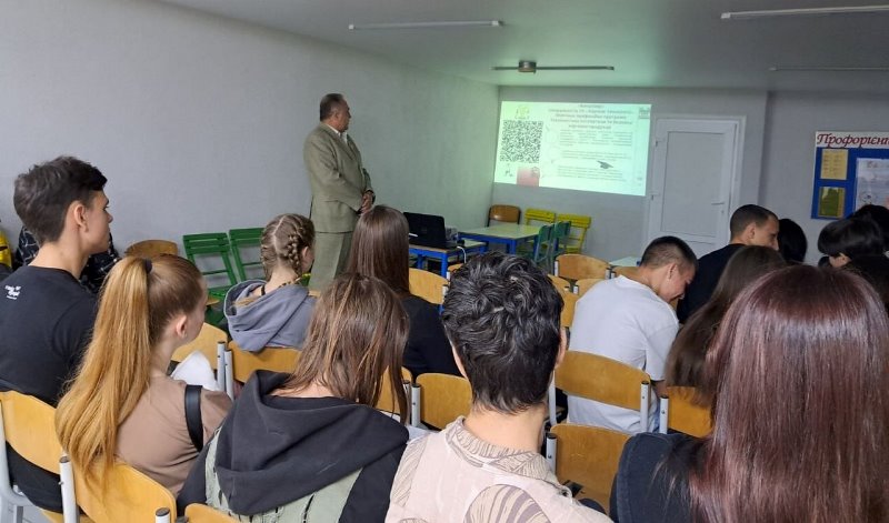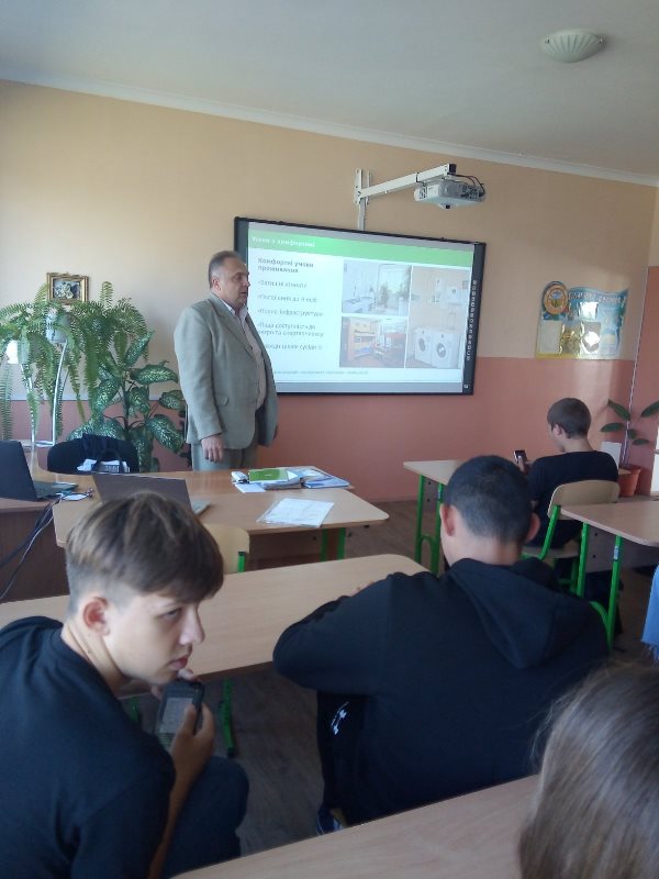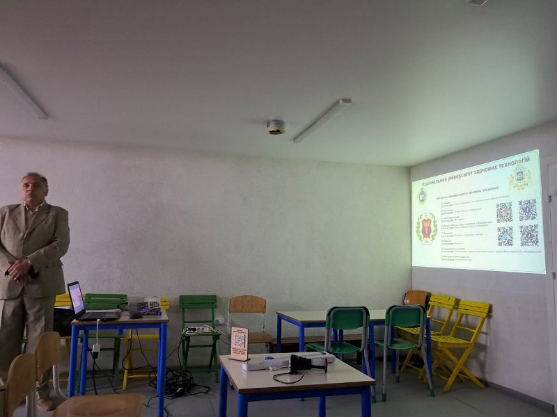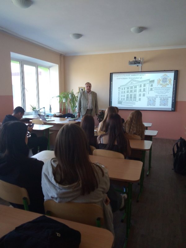 Викладач ознайомив учнів 10-11 класів зі структурними підрозділами НУХТ, освітніми програми та спеціальностями університету. Докладніше учні дізналися про матеріальне забезпечення навчального процесу випускових кафедр Навчально-наукового інституту харчових технологій, бази практики, в тому числі за кордоном, спорткомплекс, дозвілля та умови проживання здобувачів у студентському містечку університету.