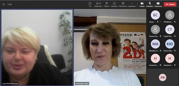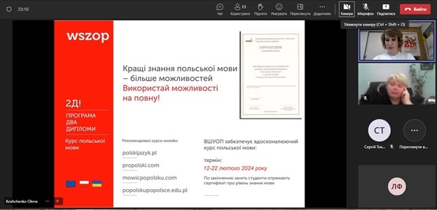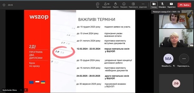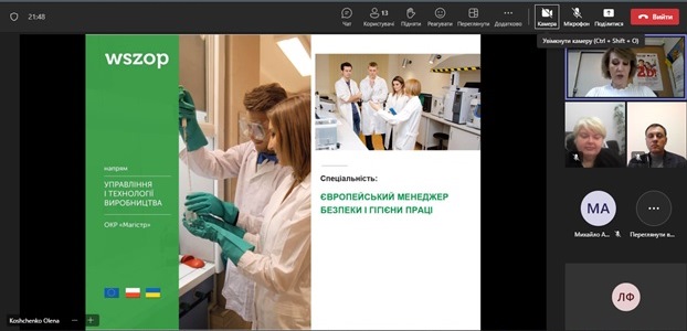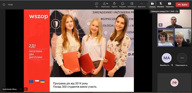 За сприяння відділу міжнародних зв’язків 15 листопада 2023 року відбулася онлайн-зустріч спеціалістки з питань міжнародної співпраці Вищої школи управління охороною праці у Катовіцах (WSZOP, Польща) Олени Кощенко зі здобувачами НУХТ. Тематикою презентації була програма двох дипломів (2D) для магістрантів.