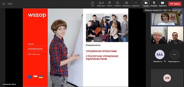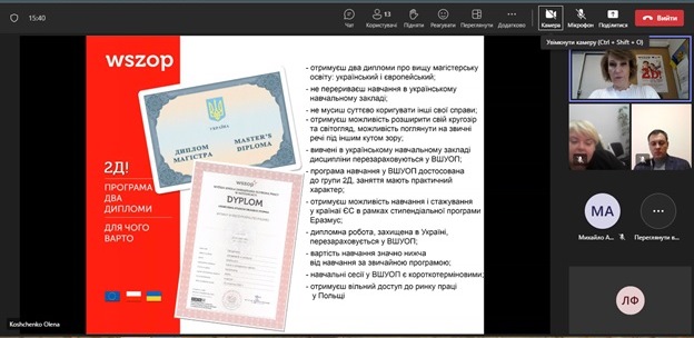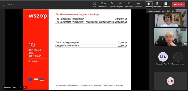 Далі фахівчиня висвітлила всі важливі аспекти у навчанні у WSZOP: умови навчання, спеціальності, терміни подання документів та ін.