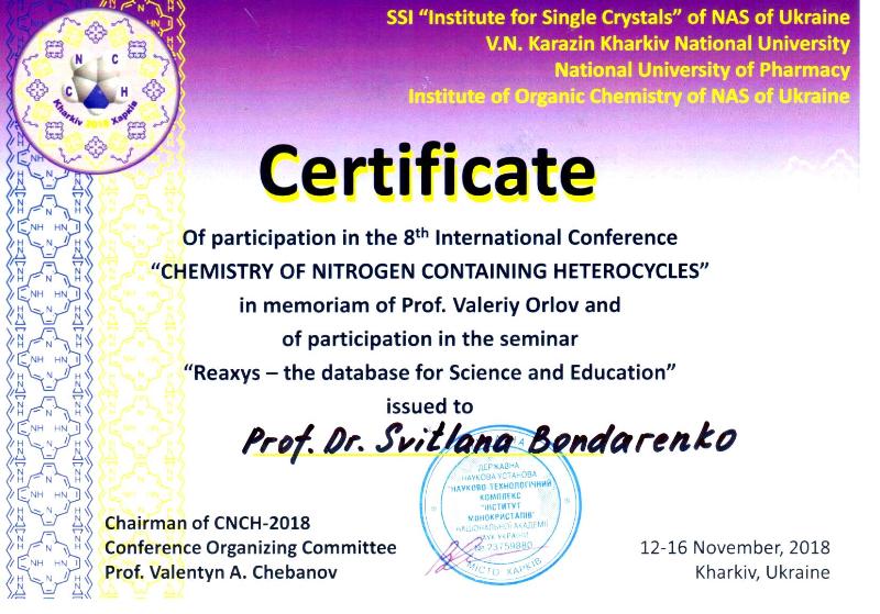 12-16 листопада 2018 року в Харкові на базі Науково-технологічного комплексу «Інститут монокристалів», Харківського національного університету імені В. Н. Каразіна та Національного фармацевтичного університету відбулася 8-ма Міжнародна конференція «Chemistry of Nitrogen Containing Heterocycles» (CNCH-2018), присвячена пам'яті її засновника – професора Валерія Орлова.