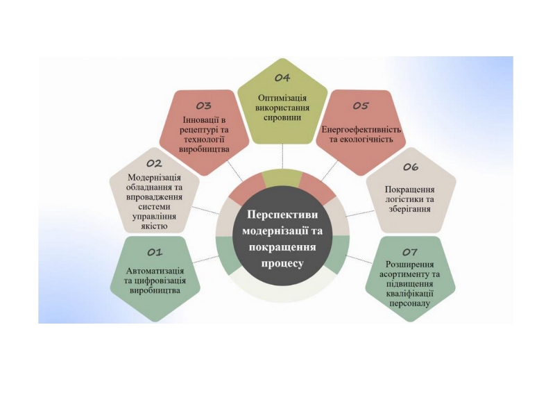 У проєкті ґрунтовно охарактеризовано діяльність підприємства, приділено увагу деяким недолікам, які можуть виникнути під час виробництва хліба (потрапляння сторонніх предметів, підгоряння хліба, зараження сировини шкідливими мікроорганізмами та пліснявіння хліба). Та найголовніше – здобувачка надала реальні рекомендації щодо поліпшення діяльності цеху хлібопекарської продукції як шляхом удосконалення рецептури хлібного виробу за рахунок додавання комплексу харчових волокон, так і з позицій модернізації роботи цеху. Зокрема, автоматизації та цифровізації, модернізації обладнання, оптимізації використання сировини, підвищення енергоефективності та екологічності (ці рекомендації повністю відповідають принципам сталого розвитку індустрії), розширення асортименту хлібобулочних виробів і підвищення кваліфікації працівників.
