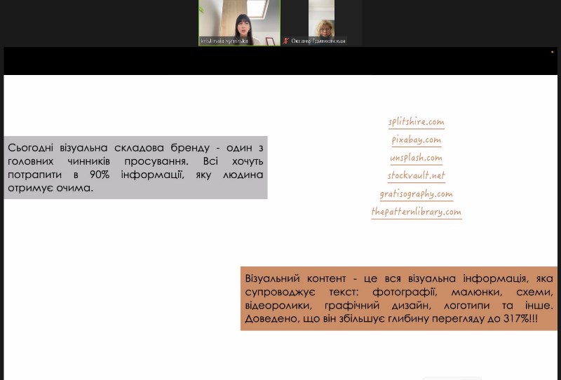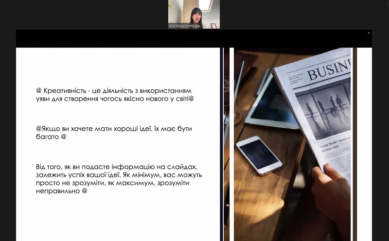 Віддалений спосіб навчання потребує якісного підходу до візуалізації супровідних матеріалів під час проведення занять. Тож, для удосконалення вмінь і навичок створення дизайну презентаційних матеріалів викладачам було запропоновано пройти навчальний тренінг «Дизайн презентації: Що? Навіщо? Як?». Спікеркою була дизайнерка Корпорації «Arterium» Крістіна Яцимірська, яка займається розробленням і створенням рекламних проєктів.