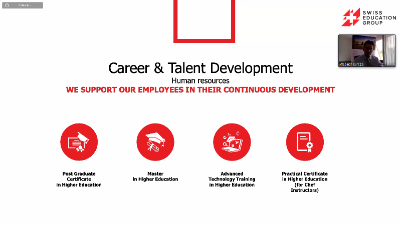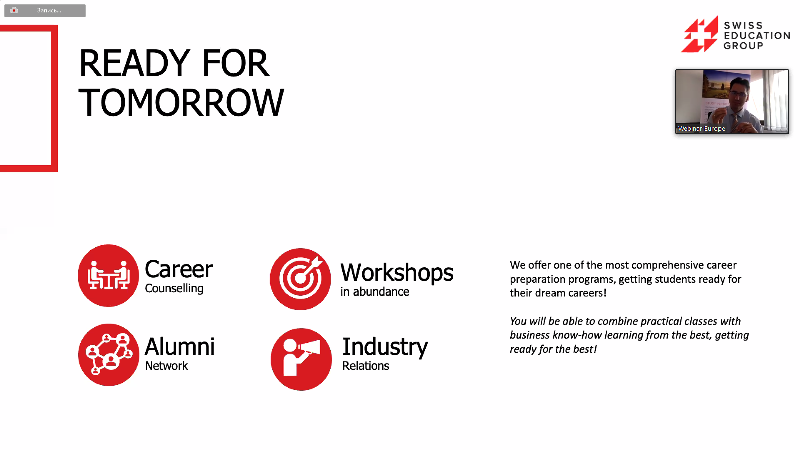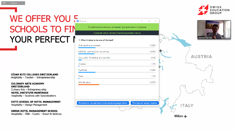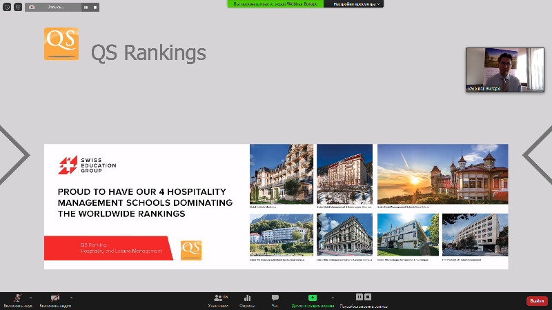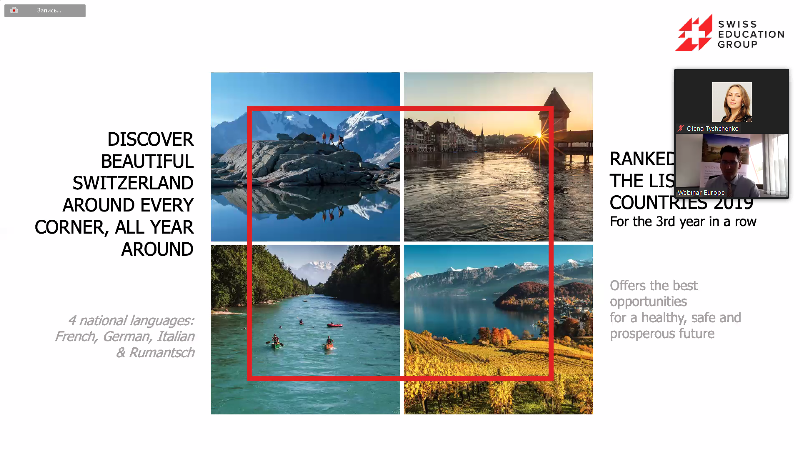 90 здобувачів освітньої програми «Готельно-ресторанна справа», затамувавши подих, віртуально подорожували неймовірно прекрасною Швейцарією і кампусами закладів вищої освіти SEG – César Ritz Colleges, Culinary Arts Academy, Hotel Institute Montreux, IHTTI School of Hotel Management, Swiss Hotel Management School.