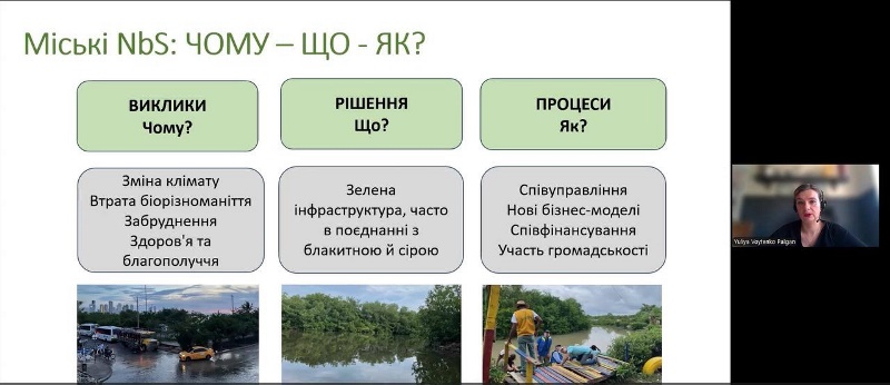 Природоорієнтовані рішення (nature-based solutions, NbS) привертають увагу як засіб для вирішення проблем сталості міст і зміни клімату. Як ефективно організувати зелену інфраструктуру міста, зберегти біорізноманіття, управляти зливовими водами чи спроєктувати зелені дахи, забезпечити комфорт жителів і долучити їх до захисту природніх зелених насаджень і, головне, де брати кошти на такі ініціативи – всі ці питання було розглянуто під час жвавої дискусії.